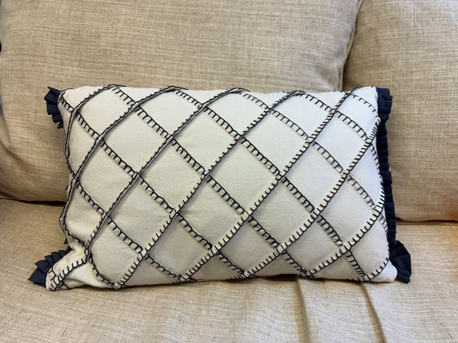 Deep Ocean. Wunderschön besticktes Kissen in crème und marineblau. Rückseite uni crème. Grösse: 30×50 cm. Inklusive Füllung.